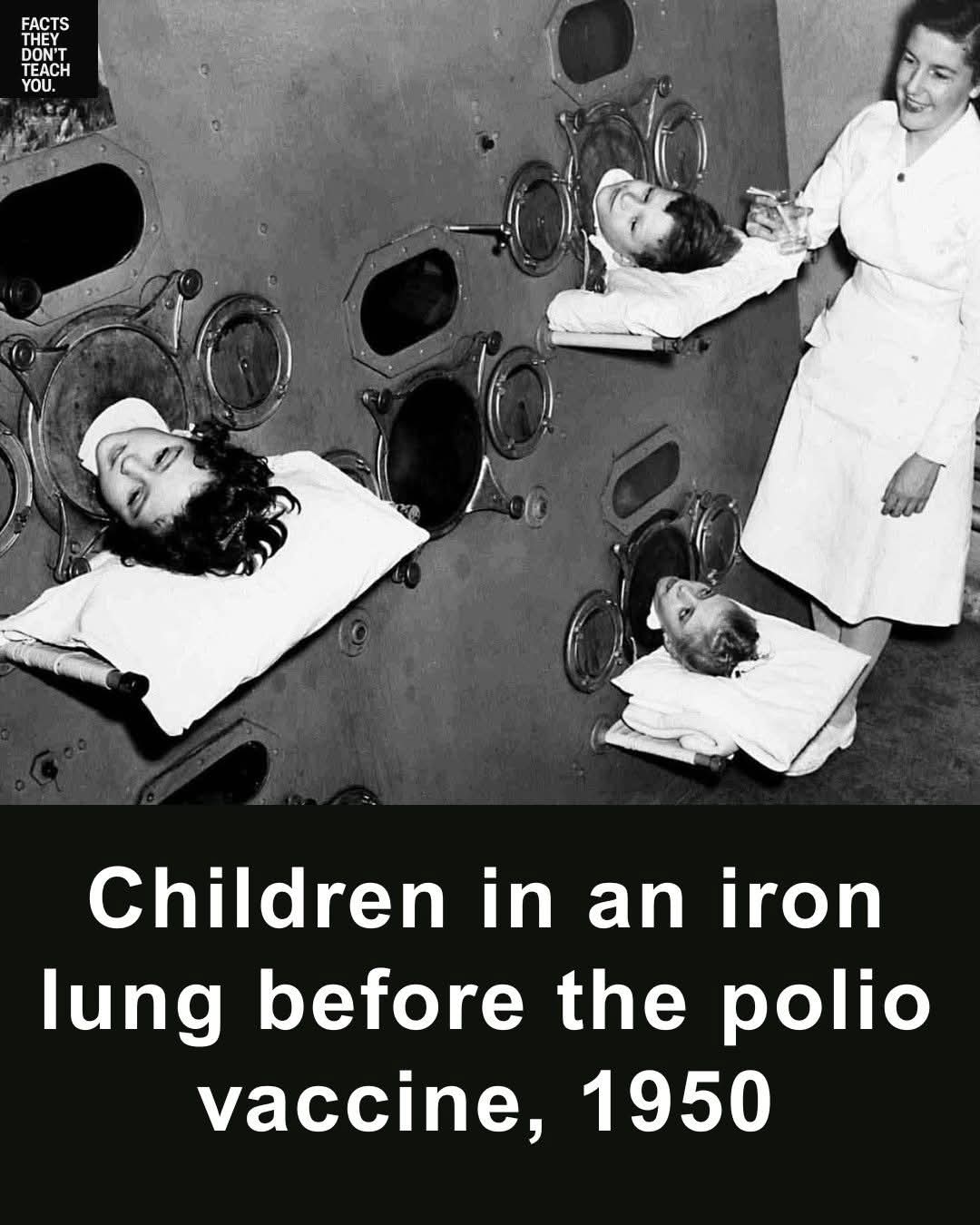 This sad photo from 1950 shows children lying in big machines called iron lungs. These machines helped them breathe when polio made their muscles too weak to work. Polio was a scary disease that hurt many children, sometimes leaving them unable to move or breathe on their own.
